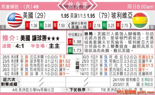 > 08:00 國際賽 美國:玻利維亞