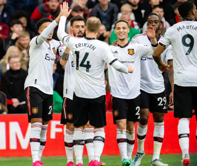 曼联首发:1-德赫亚、20-达洛特、5-马奎尔、2-林德洛夫、29-万-比萨卡、18-卡塞米罗、14-埃里克森(79‘17-弗雷德)、8-布鲁诺-费尔南德斯、25-桑乔、21-安东尼、9-马夏尔(72’27-韦格霍斯特)